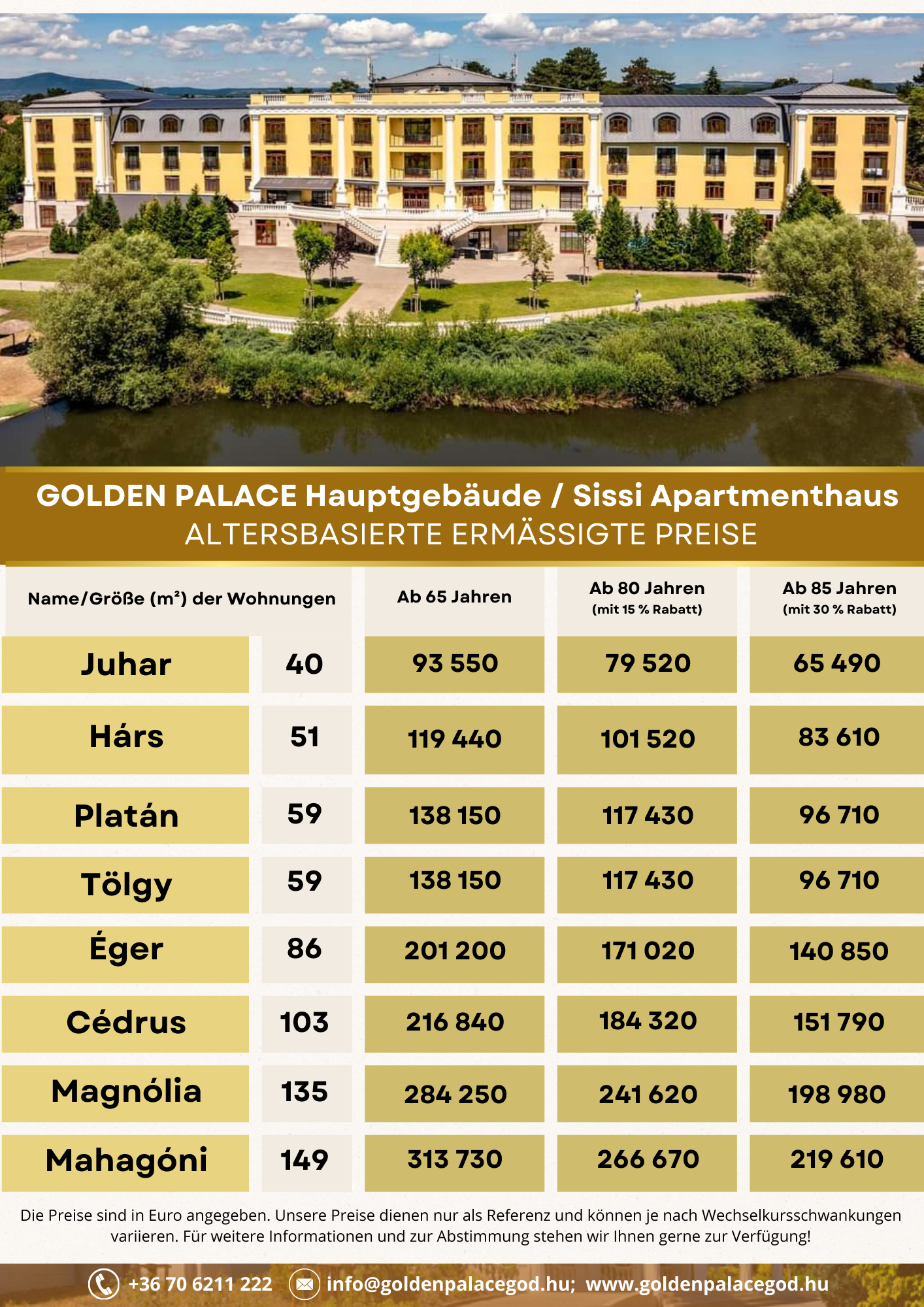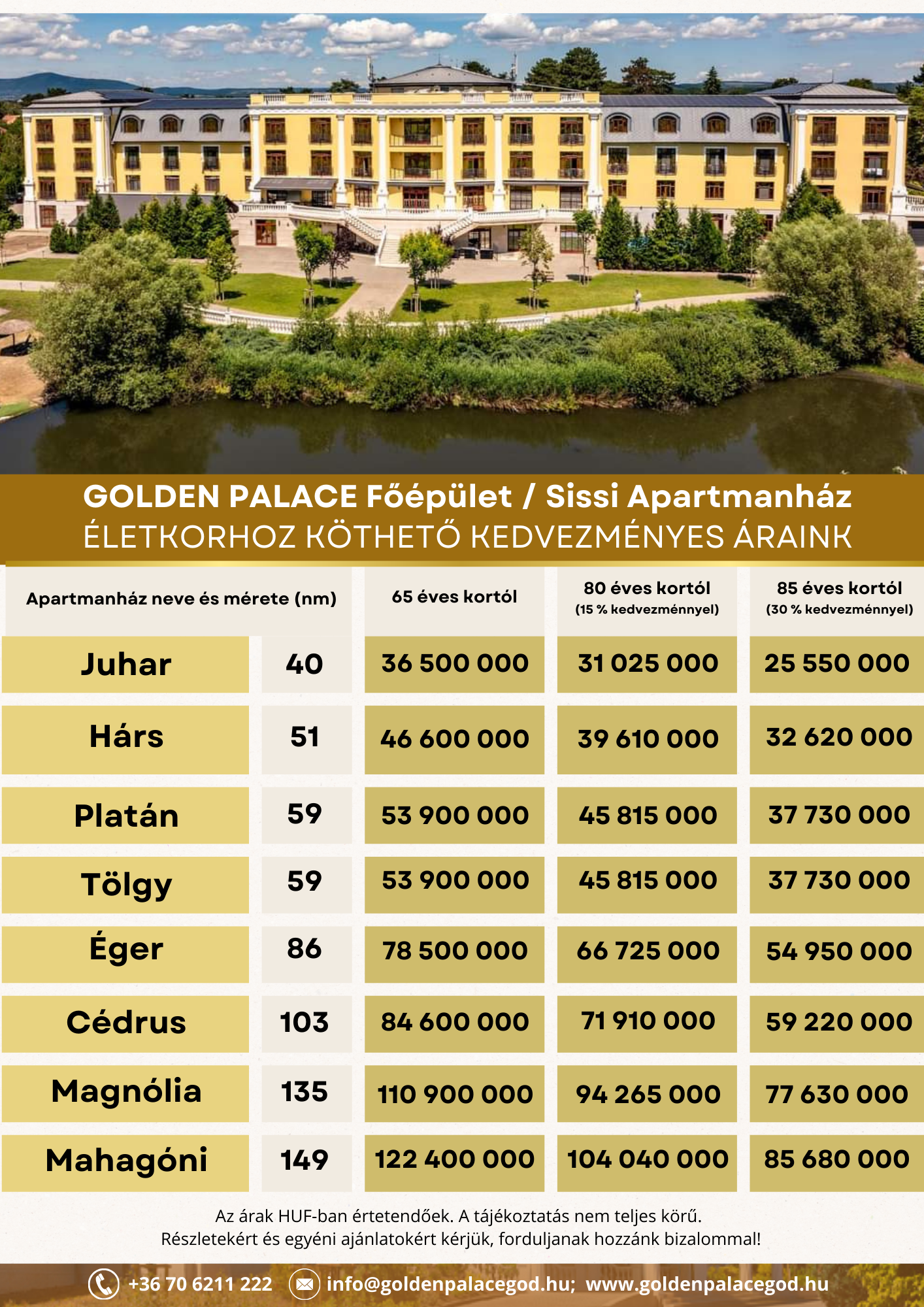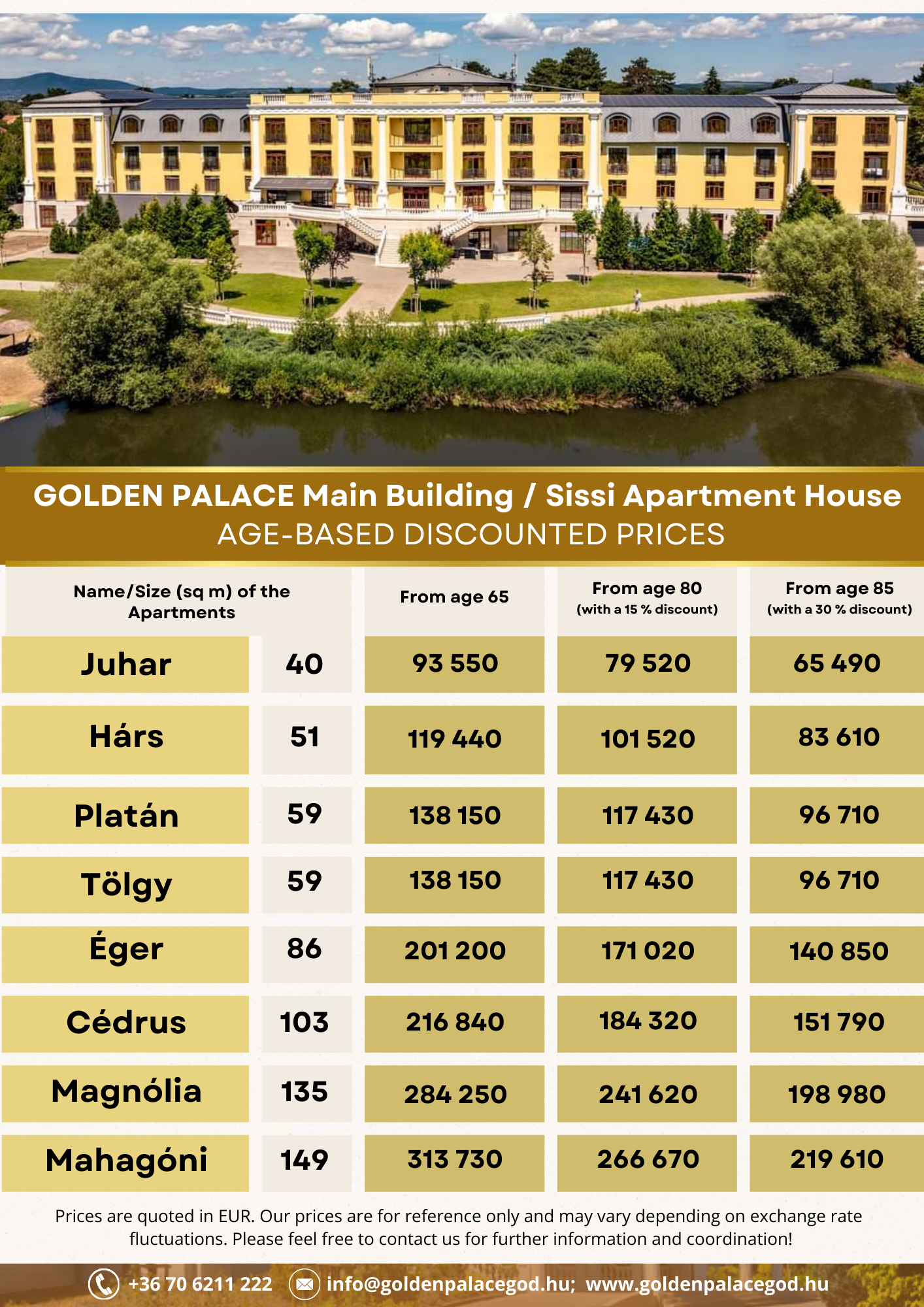 Őszintén hisszük, hogy a Golden Palace Göd nyugdíjas otthon lakóinak minden esetben különleges figyelem és gondoskodás jár. A gyönyörű Dunakanyarral szemben, Göd zöld környezetében várjuk nyugdíjas korú lakóinkat. Csodálatos kilátás, prémium lakosztályok és egy több, mint 7 hektáros park gondoskodnak arról, hogy meg tudja élni a mindennapok csodáit. , Áraink kialakításánál figyelemmel vagyunk az egyes  korcsoportokra,  tekintse meg kínálatunkat!
